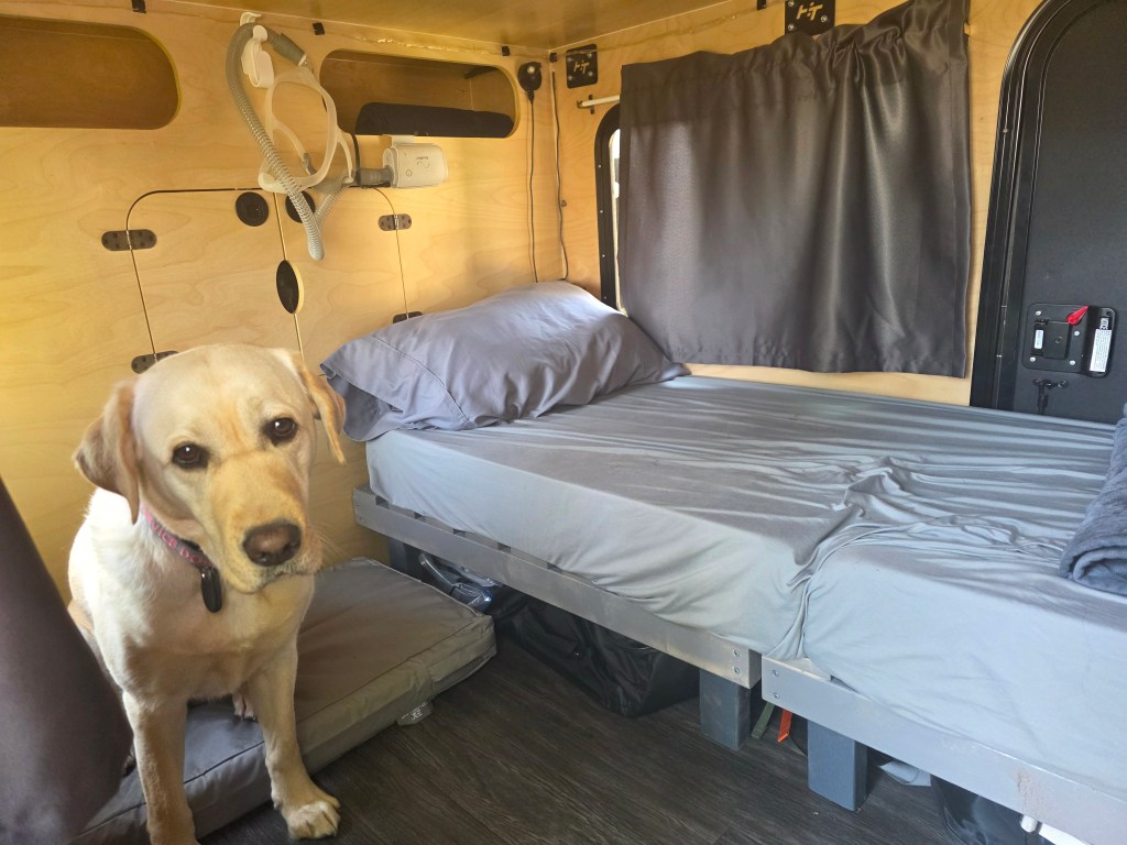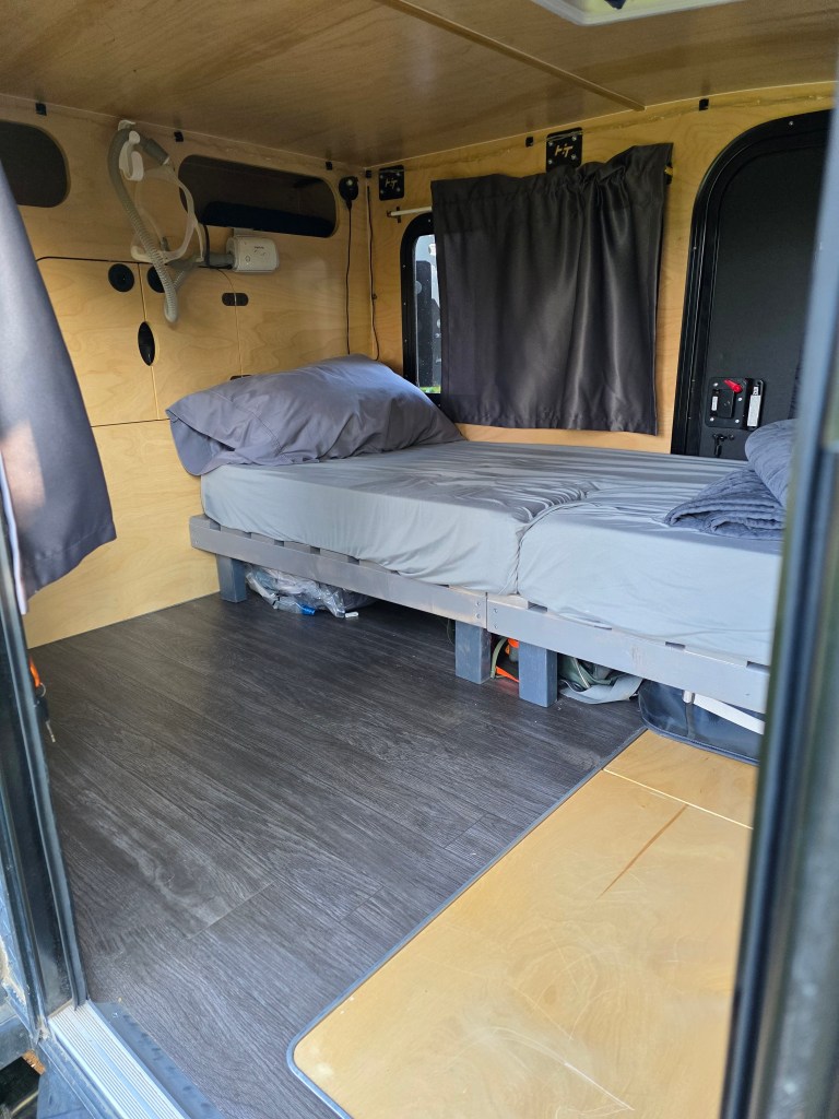 My Extreme Off Road Trailer by Hiker Trailer is small. The interior cabin living space is 6’8” long, 4’11” wide and a whopping 44” tall. Another goal when getting ready to live in this cozy space was for Nana and I to be able to go to bed without having to move anything out of the way. On my shorter trips I often had to stay someplace for one night, getting in late and leaving early. I don’t want to unpack things just for us to get a night’s rest but the reality is I have more stuff than storage. I had a 6 inch tri-fold twin XL mattress on the floor that took up a good majority of the space. Although it was nice and comfy with plenty of room to stretch out I missed having floor space. When hanging out in the trailer while raining I felt like I was always still in bed (I guess technically I was). I missed the floor space. A place to put my shoes, or for the dog to jump up too, that wasn’t where I also slept. I took the tri fold mattress out and separated the three sections. After turning the two sections 90* and discarding the third I found that my twin XL is now a cot XL size. The amount of floor space recovered was remarkable, however, I still have a storage issue. Mary recommended a lifted bed platform with storage underneath, so that’s what I built. Using mostly scrap lumber I already had laying around the garage and about $18 of additional wood for the slats I built the platform with 8” of storage underneath it. I am able to fit a camp chair, tote of exercise bands, vacuum compressed bag of blankets, 65 liter backpacking pack, two duffle bags and there is still some room to stuff items in! The best part is I can sit on the bed like a bench which makes getting dressed and putting on shoes so much easier. If I am sitting with exceptional posture I will hit my head but a relaxed laid back position is perfect. Putting the platform in there changed the look and feel of the trailer. It makes it feel more like a home and not like I’m sleeping on someone’s floor for the night. It has a resonance of permanence and I love it!