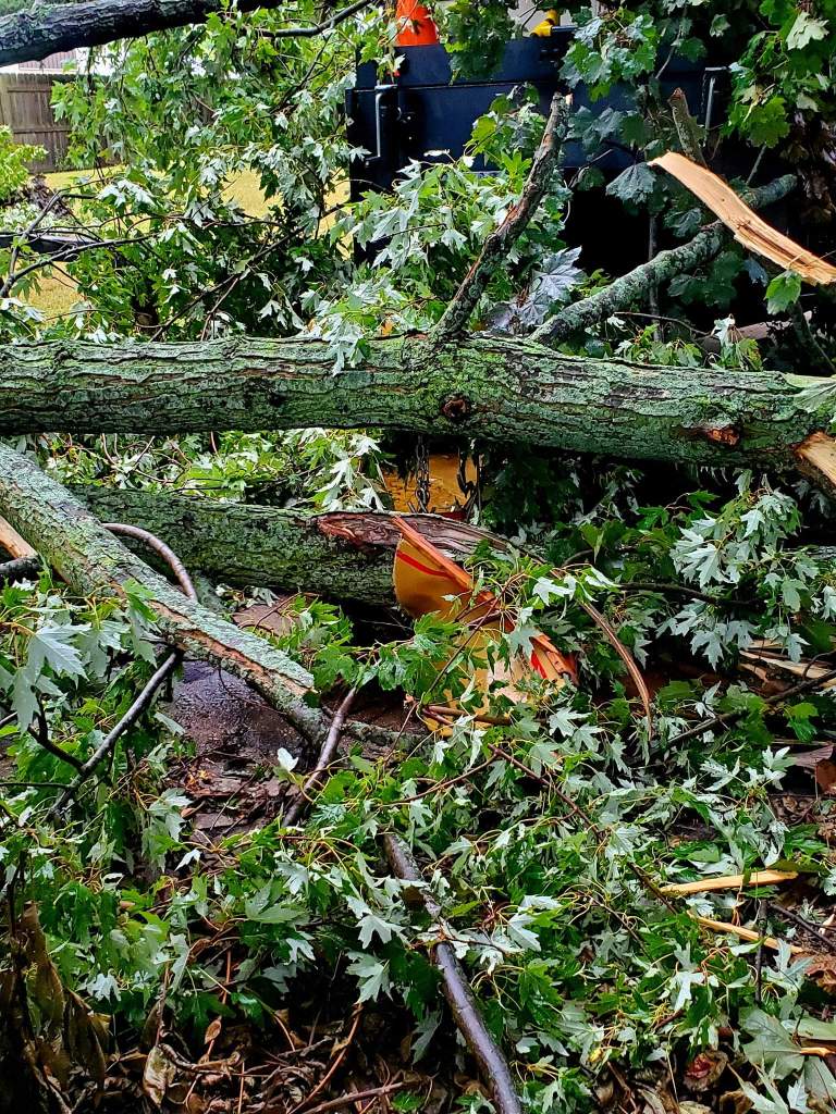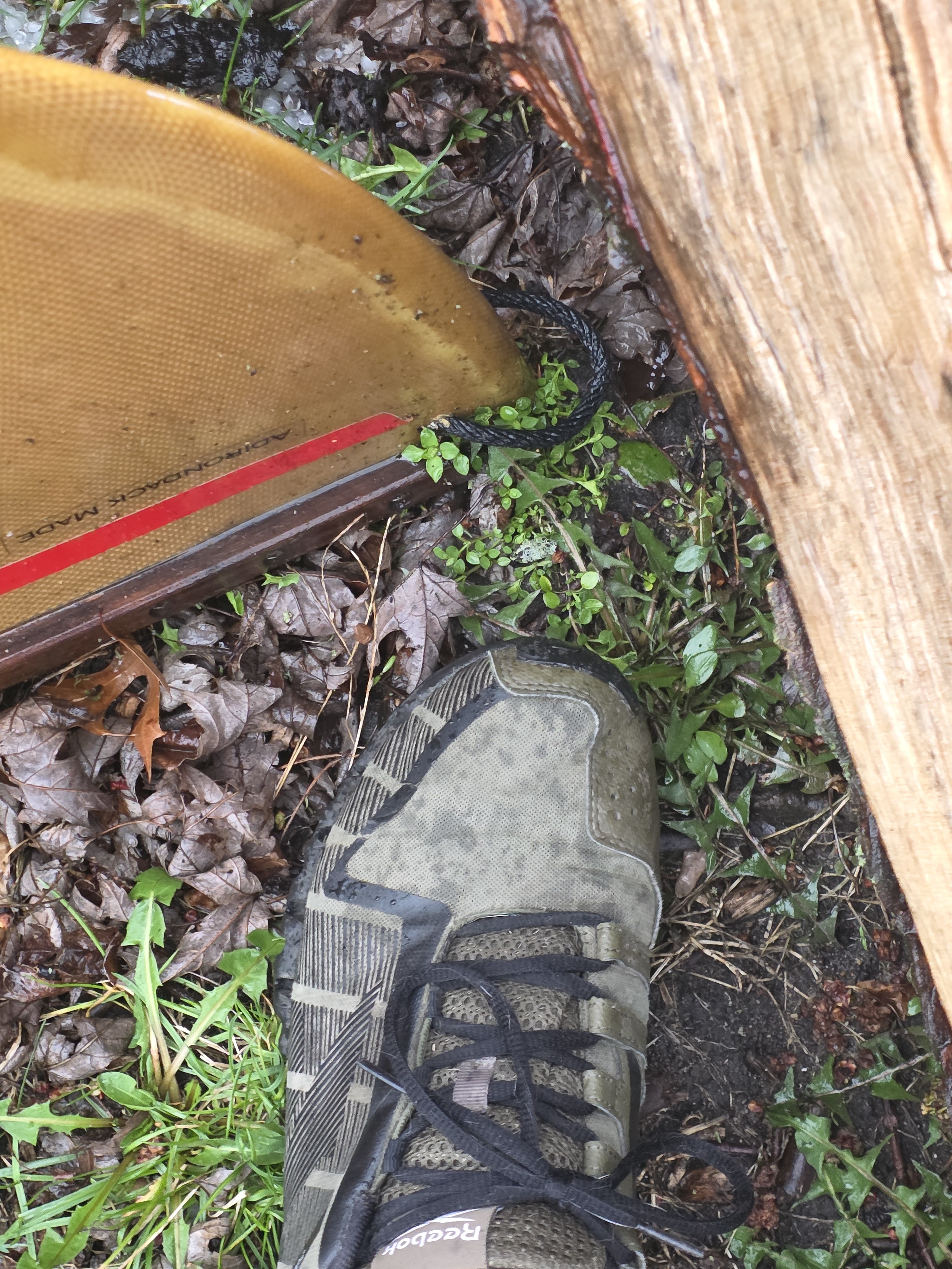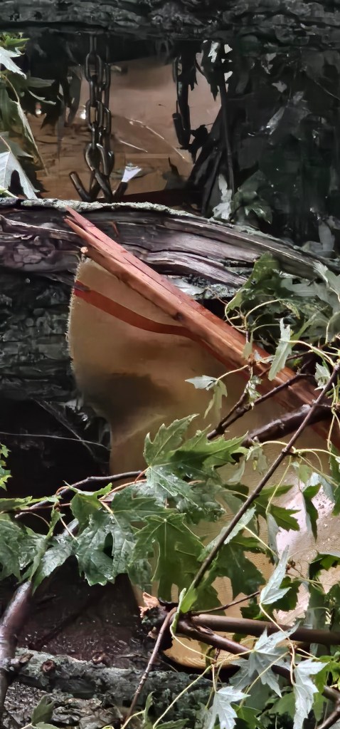 Mother Nature can be a fickle bitch some days but what can you do? Probably out of spite, I left the busted up boat out all winter. It made sense in my head at the time. Instead of storing it in the garage, the boat was left exposed to the elements. This spring another storm came through. This time, Mother Nature only issued a warning shot. She reminded me I shouldn’t be lazy. I should have cleaned it up last fall. A large branch from the same damn tree fell during that storm. This time It missed the stern of the canoe by mere inches!