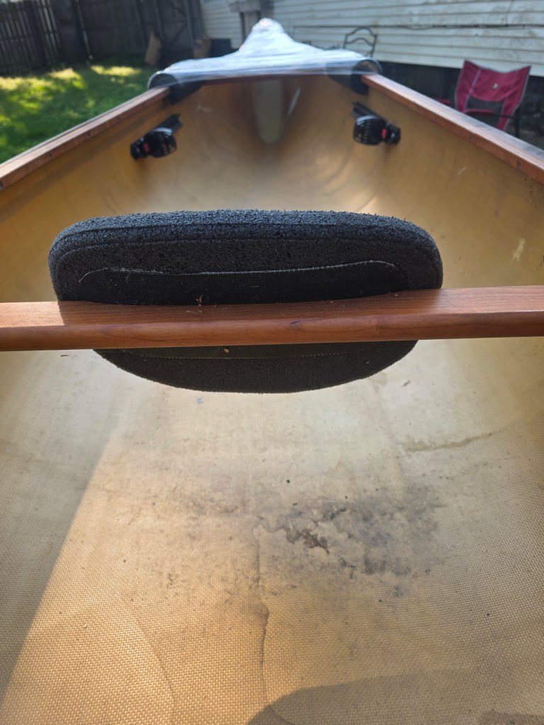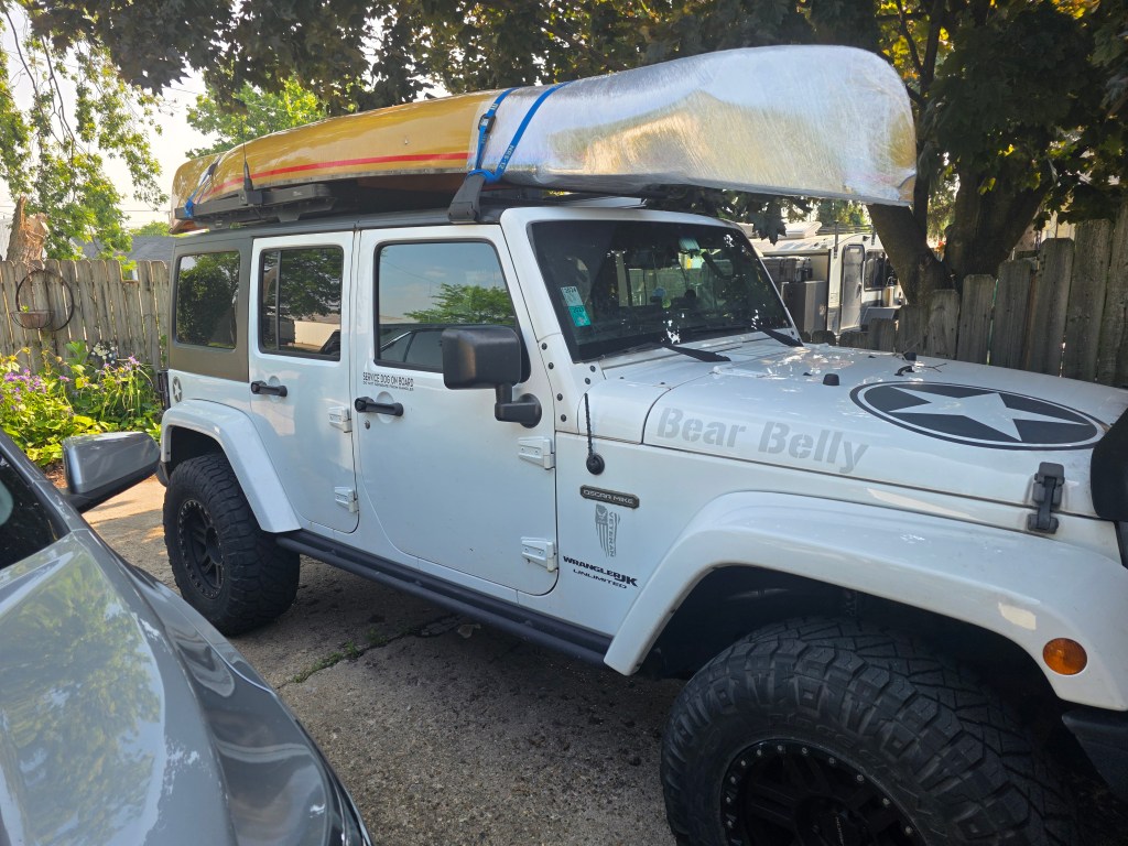 Next week on the 18th of June I leave for for Olmstedville, New York to finally get it fixed. I can’t toss a boat with a floppy bow up on the Jeep and travel down the highway. I decided to wrap the bow with cellophane to keep it all together for the road trip. Initially, I was going to place the bow off the back of the Jeep. However, the wrap job created a pocket. I was concerned the air would get trapped in there while driving. It will blow the end off like an oversize party popper. With that image firmly planted in my mind, I moved the bow to the front instead. This way, I can see it from the driver’s seat. Hopefully, I can stop in time if cling wrap isn’t the answer and things start to unravel.