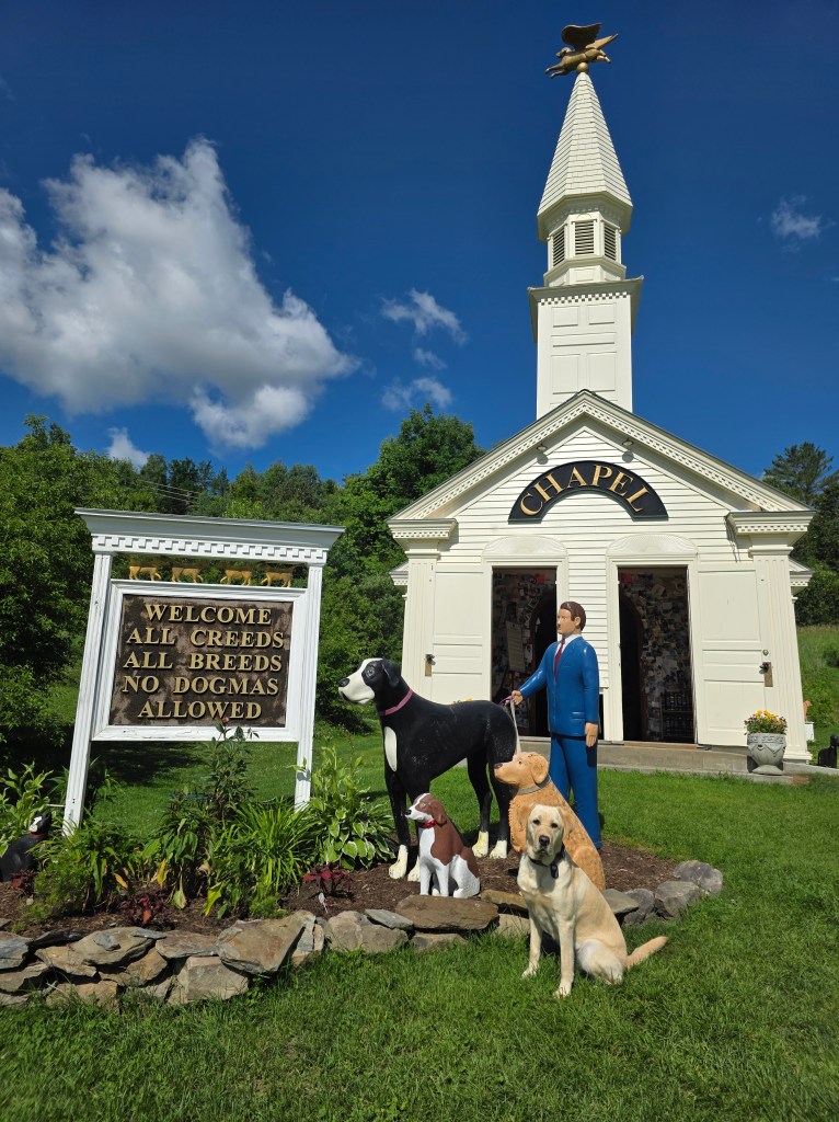 I really needed a hot shower. The New Hampshire weather has been on the cooler side. However, the humidity is high. It has been about a week since my last shower. Pee-Yeew. I was ripe. I found a truck stop in St. Johnsburg, Vermont about 30 minutes away that has a shower. After one of the best hot showers I’ve had in a while I sat in the Jeep and looked up things to do in town since we’re there. One thing that caught my eye was something called Dog Mountain and Dog Chapel. The first thing that pops into my head was Stephen King’s, Pet Sematary. Luckily it was nothing like that. Not today Gage!