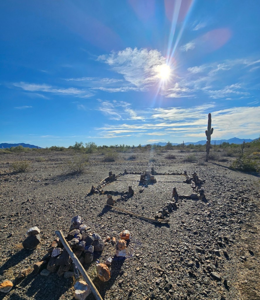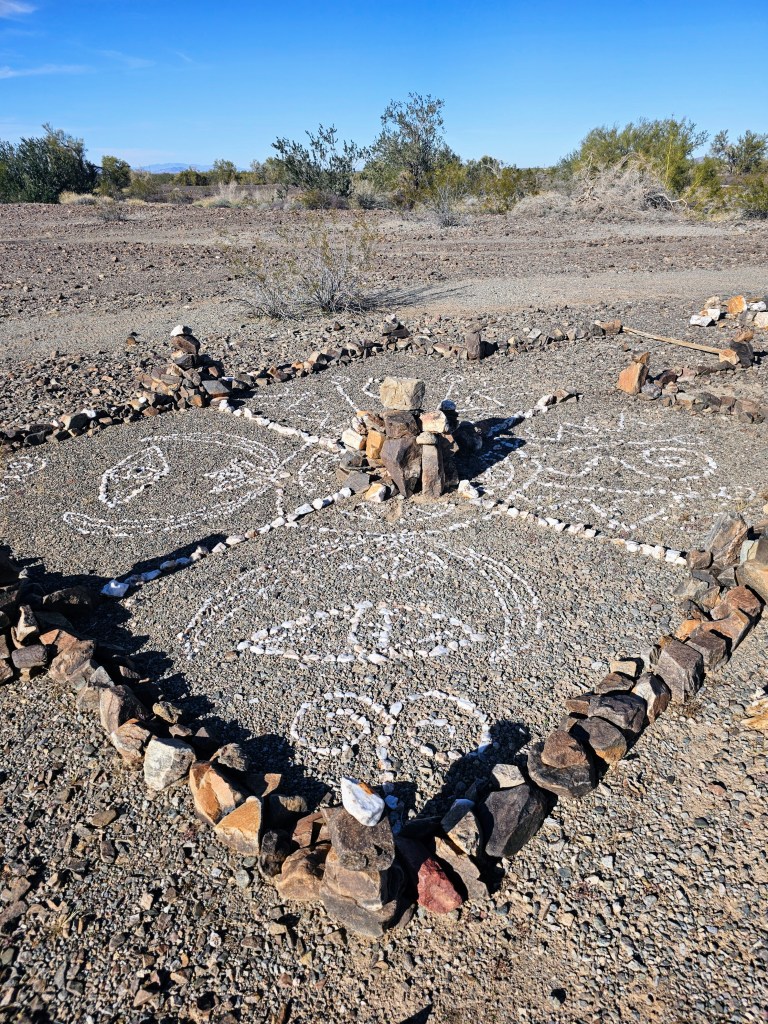 Along the way are areas of what I call “desert art” — patterns made from natural white quartz stones, some large enough to be visible on Google Maps satellite view. One such piece is called the Magic Circle Labyrinth, which I initially assumed explained the area’s name.