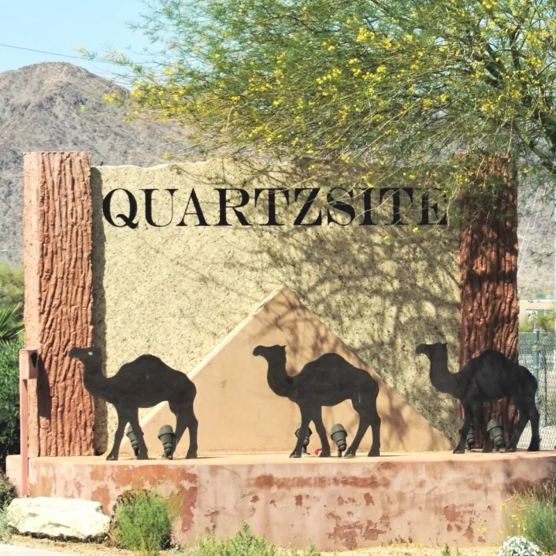 Quartzsite began as a mining and stagecoach stop in the 1800s, originally called Tyson’s Wells after a local miner. Over time, it became a crossroads for travelers and prospectors, and later a hub for gem and mineral trading — a legacy that still defines the town today. Its winter population boom is a relatively modern phenomenon, driven by RVers and snowbirds seeking warm weather and open desert living.